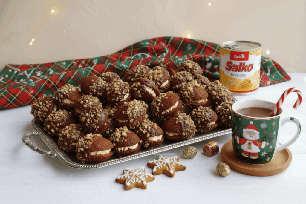 Ingredience 150 g hladké mouky 130 ml smetany ke šlehání 2 vejce 70 g másla 30 g kakaa 120 g cukru půl prášku do pečiva 2 lžičky perníkového koření špetka soli Na dokončení: 250 g mascarpone, 100 g Salko tradiční, 1 sklenička marmelády. Postup Na těsto smíchejte mouku s práškem do pečiva, cukr, sůl, perníkové […]